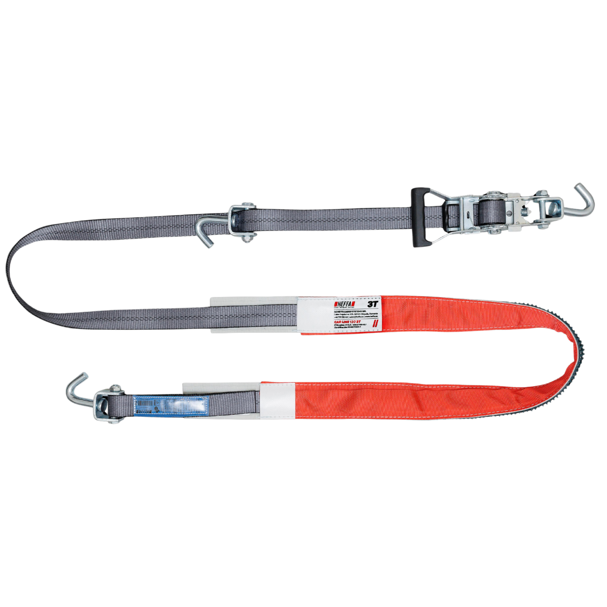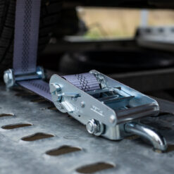 Cinghia di fissaggio per auto da 3 tonnellate , larga 35 mm, con protezione in tessuto e ganci girevoli. Ideale per il trasporto sicuro di auto su piattaforme di varie dimensioni. La protezione in tessuto in dotazione garantisce una presa extra durante il trasporto delle auto sulla piattaforma e protegge la cinghia.