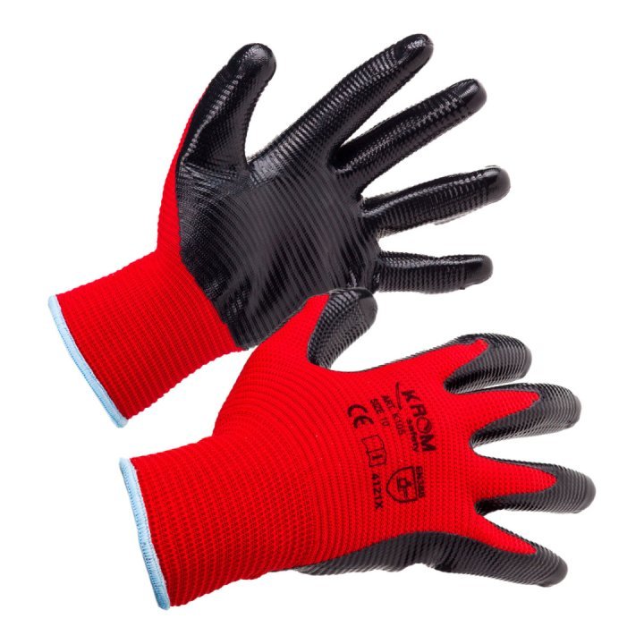 Mănuși pe bază din poliamidă striată, roșie; palmă imersată în nitril negru cu rezistență sporită la produse petroliere; manșetă elastică, dosul palmei aerisit
